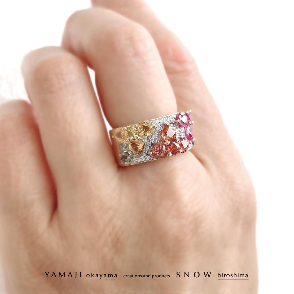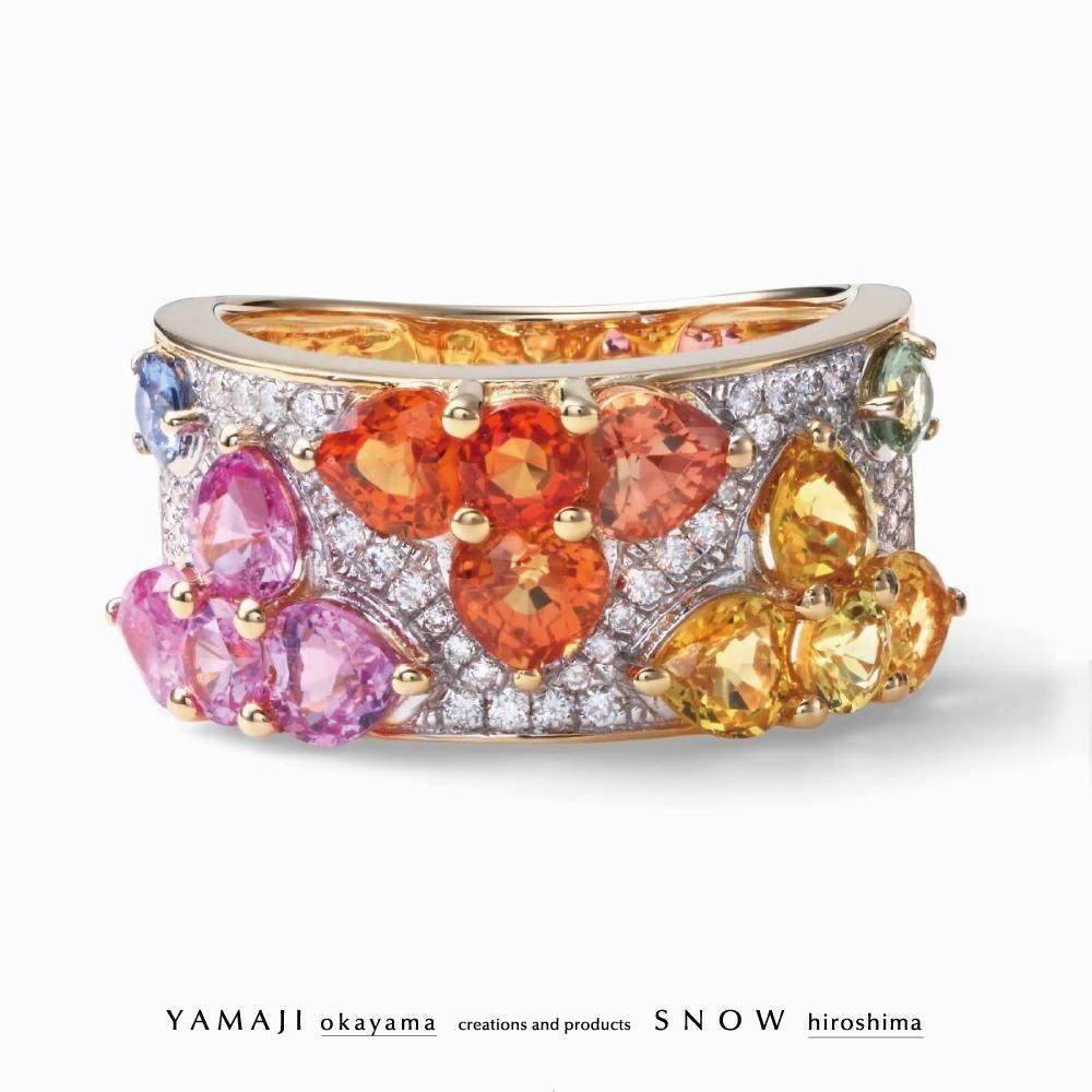 幅広のリングを舞台に、カラーサファイアとダイヤモンドが織りなす絢爛たる花模様。