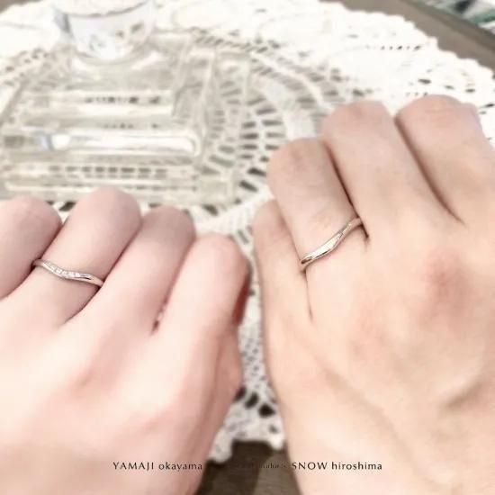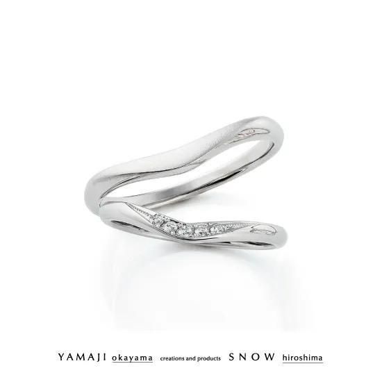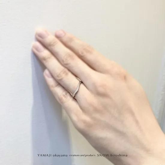 指がすっきりと長く見えるVラインの結婚指輪。華奢なデザインにダイヤを5石、ぎゅっと敷き詰めました。身につけるたびしっくりなじんで、あふれる2人の愛が感じられるリングです。