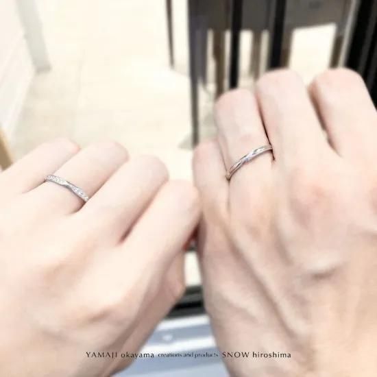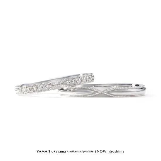 女性リングはリボンを結ぶように施されたミルグレインにダイヤモンドを12石あしらったエタニティスタイル、男性リングはシンプルだけどミルグレインが際立つデザインの結婚指輪に仕立てました。