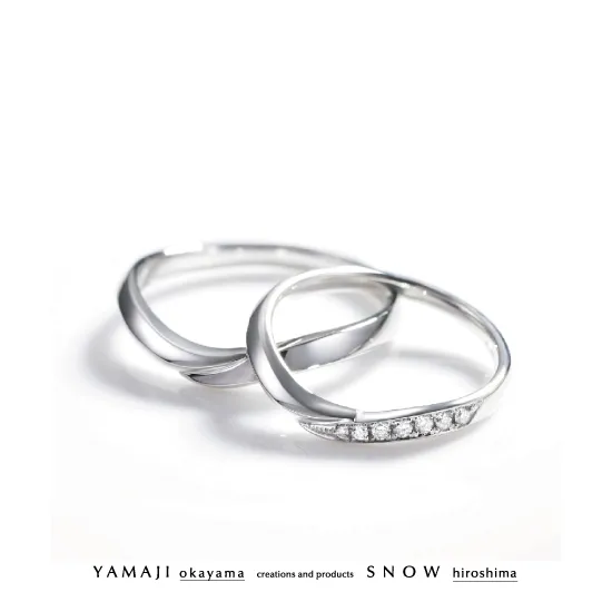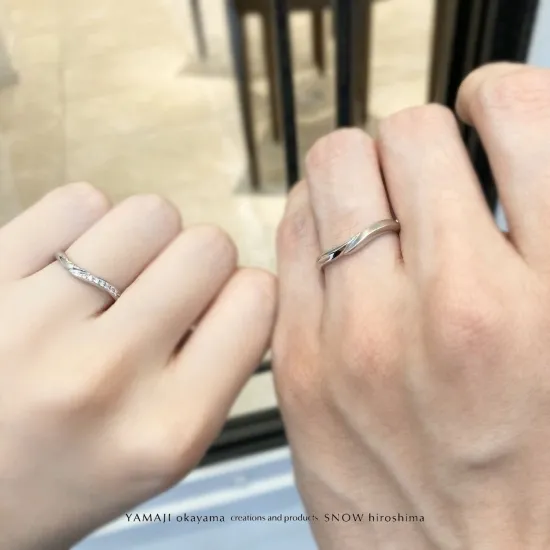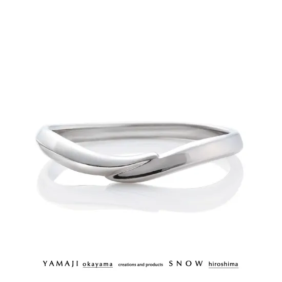 左右から伸びるカーブは中心で重なり合い綺麗なVラインを描きます。指を美しく長く見せる美的効果があり、男女ともに人気のマリッジリングです。