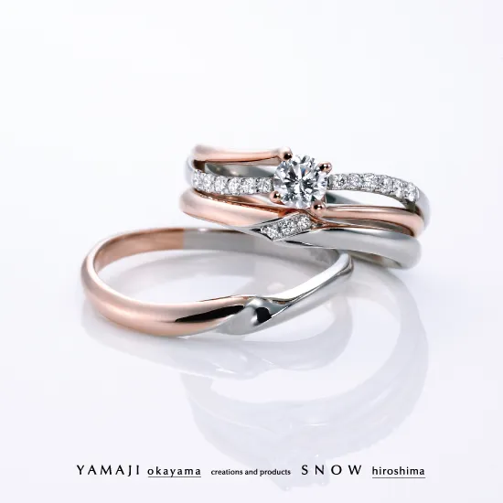 ピンクゴールドとプラチナを男女に見立て、ウェーブを描き自然と溶けあうように一つになるイメージでデザインしました。